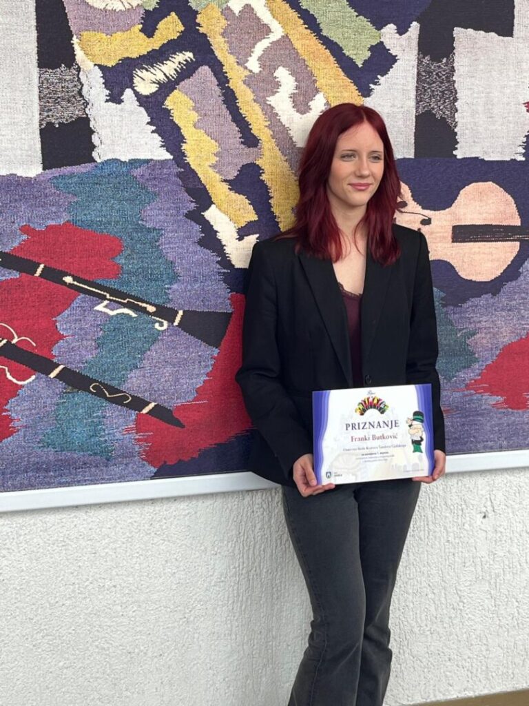 Franki Butković, državnoj prvakinji u poznavanju engleskog jezika i njezinoj mentorici profesorici Jasminki Šilović uručena su priznanja za postignuti uspjeh.