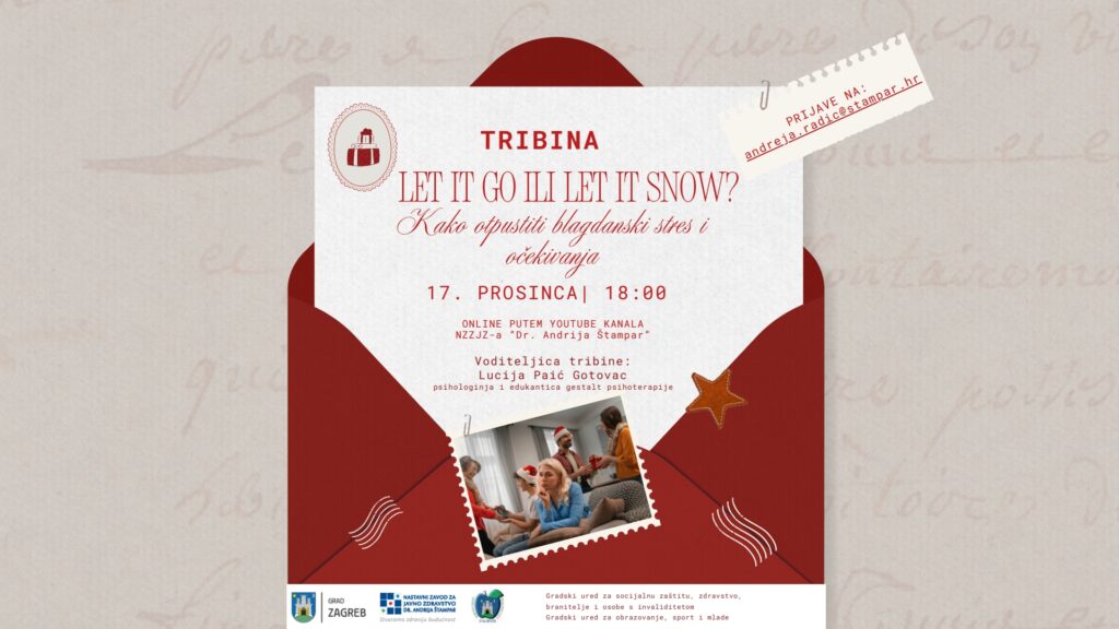 objavljujemo poziv Službe za mentalno zdravlje i prevenciju ovisnosti NZJZ „Dr. Andrija Štampar“ na Tribinu za roditelje pod nazivom “Let it go ili Let it snow? Kako otpustiti blagdanski stres i očekivanja?, koja će se održati 17. prosinca 2025. godine s početkom u 18,00 sati putem You tube kanala.