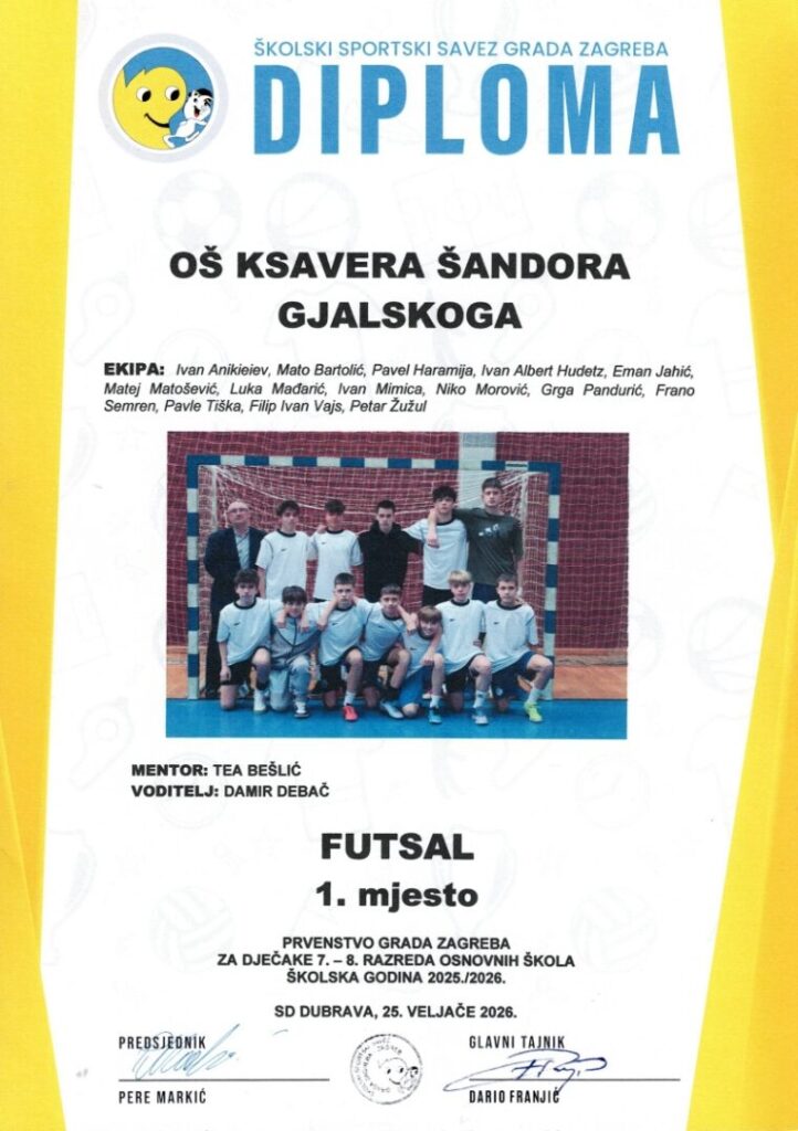 U srijedu, 25. veljače su učenici naše škole, u finalu Prvenstva Grada Zagreba u futsalu pobijedili učenike OŠ Silvija Strahimira Kranjčevića rezultatom 6:1 i tako postali prvaci Grada Zagreba, usto i ostvarili najbolji rezultat u povijesti naše škole u sportskim natjecanjima.
